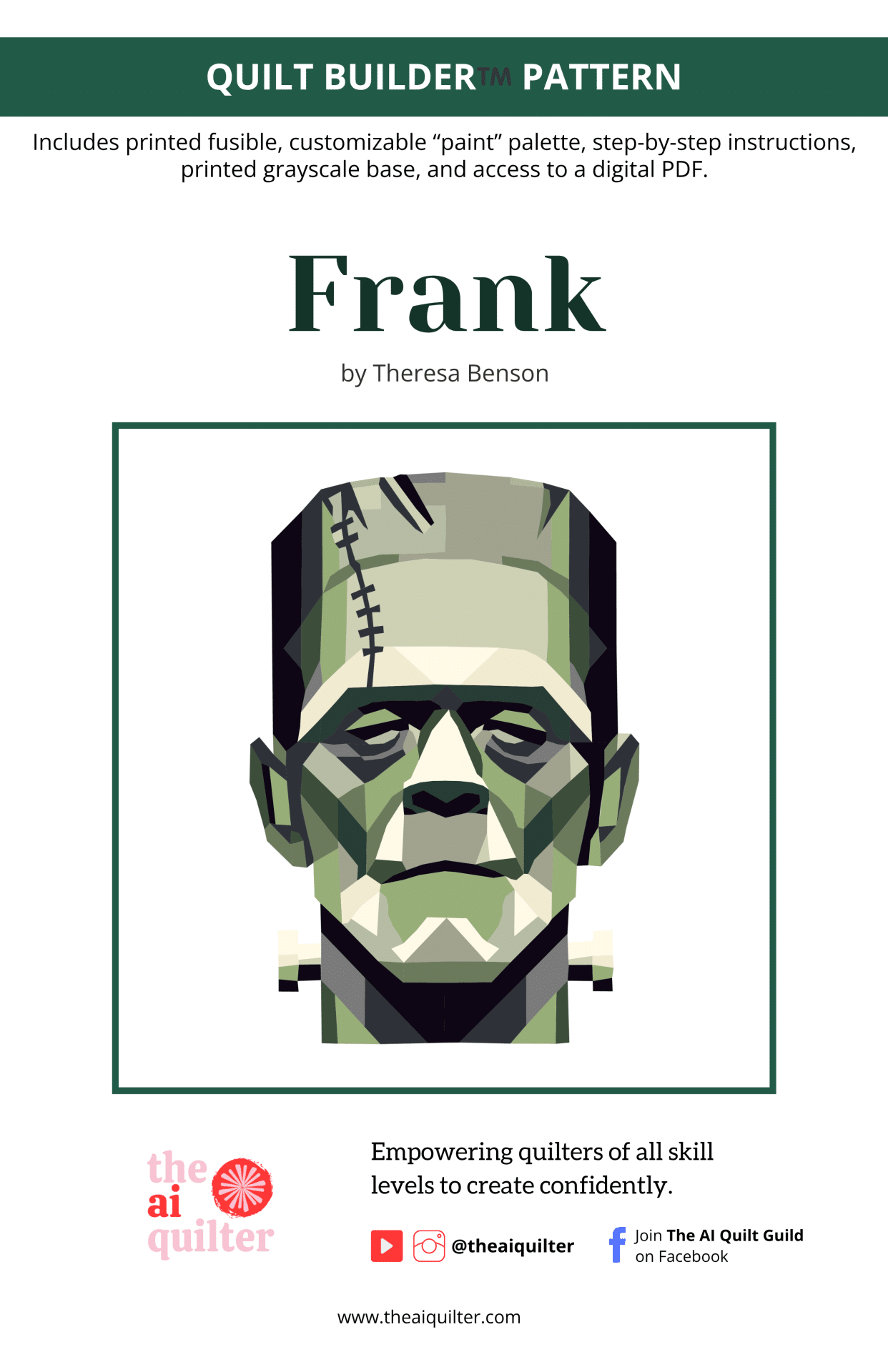 Make him haunted or hilarious, brooding or bold. Whether you’re stitching solo or pairing him with Wifey for a monster mash moment, Frank gives you a thrilling playground for color theory, storytelling, and statement quilting.
