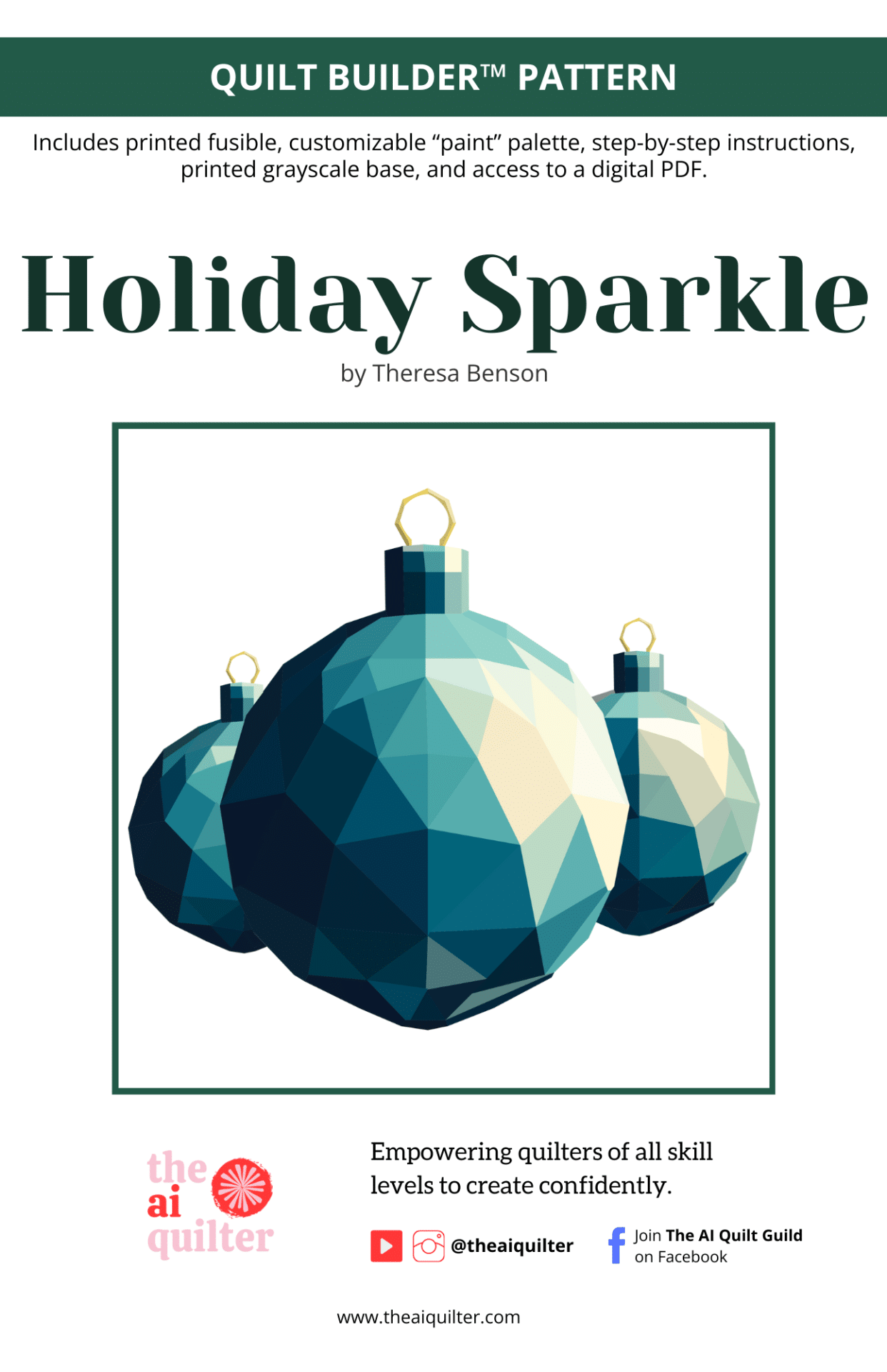 Meet Holiday Sparkle, a vibrant quilt builder pattern that captures the magic of the holiday season with a modern, geometric twist. Designed by Theresa Benson, The AI Quilter, this builder pattern is perfect for quilters ready to experiment with color and pattern customization. With the original icy blue colorway and multiple additional color options included to spark your imagination, you’ll find endless possibilities to make this design uniquely yours. Whether you’re creating a cozy wall hanging or adding a festive pop to your decor, Holiday Sparkle invites you to explore your creativity with ease and guidance.
